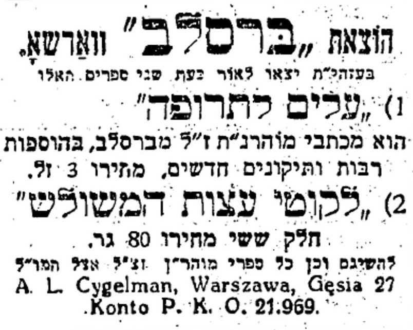 לבם של האחים ר' בירך ור' ישראל דוד יקד להדפסת ספרי רבינו, ובשנת תרפ"א, בהיותם עדיין נערים צעירים, הדפיסו בלובלין בבית הדפוס של ר' לייבל פראמפעלער מחסידי ברסלב, את הספר הקדוש חיי מוהר"ן. כמו כן, ערכו עם חבריהם סעודות הילולא לרבינו ומוהרנ"ת.