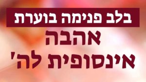 ...פנימה בוערת אהבה אינסופית לה' "כי יש שני מיני אהבות, אחת שהיא אהבה שבימים... ויש אהבה שהוא בדעת". (ליקוטי מוהר"ן ח"א, לג) האהבה שבינינו לבין הקדוש ברוך...